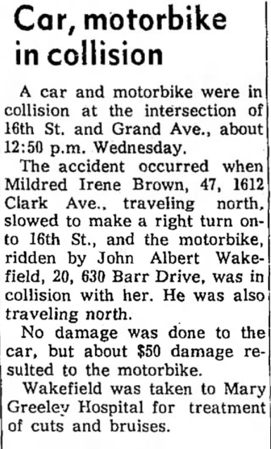A clipping about an accident John Wakefield was involved in as a young adult that was published in The Tribune on May 21, 1964.