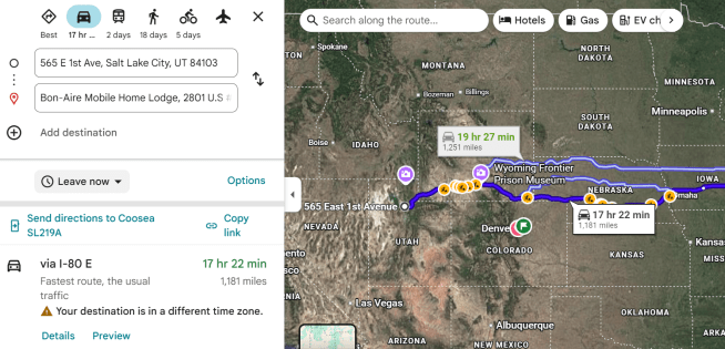 A possible route from Bundy’s residence on East 1st Avenue in SLC to the Bon-Aire Mobile Home Park in Iowa City, IA.