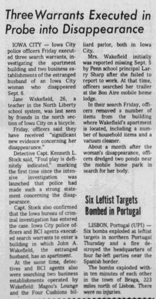 At roughly 10:15 AM on the morning of January 30, 1976, Captain KL Stock of the Iowa City Police Department announced they had received ‘significant new evidence’ regarding the disappearance of Jane Wakefield. Armed with three search warrants for the apartment building the two businesses owned by John Wakefield, ‘Magoo’s Lounge’ (located at 206 North Linn Street) as well as ‘Four Cushions, Inc‘ (a billiards parlor located on Clinton Street). Captain Stock said a vacuum cleaner was taken from Wakefield’s residence and five more were seized across his two businesses; their contents were sent to ‘various labs’ for examination; additionally, forensic experts sifted through the contents of the incinerator and sent them to the state crime lab in Des Moines. Everything came back inconclusive.