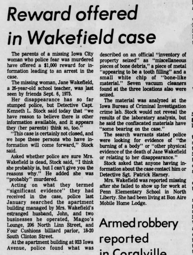 An article about foul play being involved with the disappearance of Jane Wakefield that was published in The Iowa City Press-Citizen on January 30, 1976.