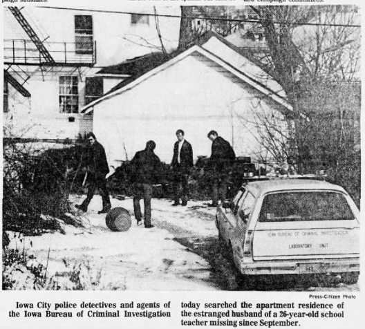 From the apartment, Iowa state detectives along with agents from the Iowa Division of Criminal Investigation seized miscellaneous pieces of ‘bone debris,’ a small hunk of metal that looked to be a dental filling, along with a ‘small, white chip of bonelike material.’ They also seized five vacuum cleaners from the two businesses and the following week on February 6, 1976 roughly twenty detectives returned to the area and searched (on their hands and knees) through several miles of ditches north of Iowa City along the I-80; lab analysis of bone fragments found in the incinerator were inconclusive.