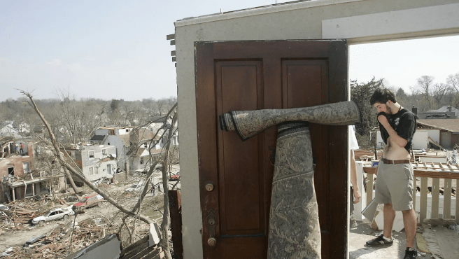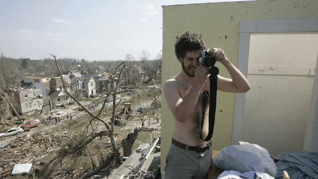 A picture of University of Iowa sophomore Ted Krausman taking a picture of what was left of his 3rd floor apartment located at 923 Iowa Avenue in a picture taken on April 14,2006 in Iowa City, Iowa. Krausman’s apartment lost its roof and most of its walls Thursday night when a tornado ripped through the area. Photo courtesy of Matthew Holst of The Iowa City Press-Citizen.