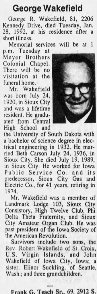 The obituary for John’s father George R. Wakefield, who died at the age of eighty-one in 1992 that was published in The Sioux City Journal on February 3, 1992.
