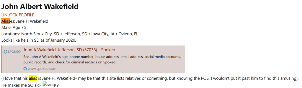 Part of John Wakefield’s background check from a comment on a crimewatchers.net post about Jane Ellen Wakefield made by user ‘GarAndMo39.’