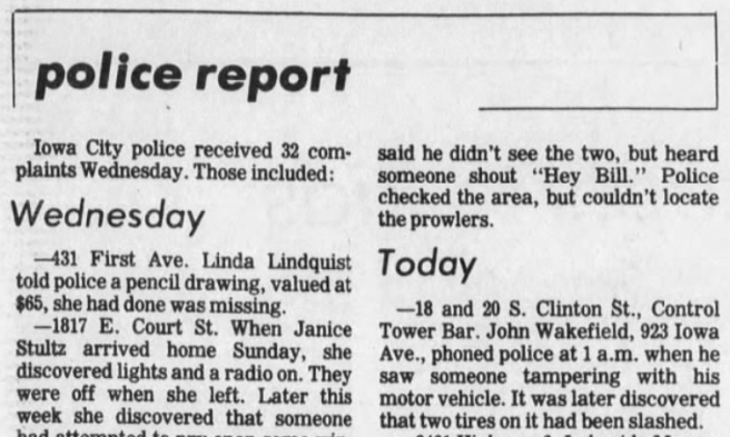 Someone slashed two of John Wakefield’s tires, according to the ‘police report’ that was published in The Iowa City Press-Citizen on October 5, 1978.