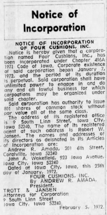 A clipping about one of the businesses that John Wakefield owned that was published in The Iowa City Press-Citizen on February 5, 1972.