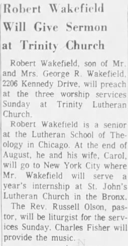An article about John Wakefield’s brother giving a sermon at a local chutrch that was published in The Sioux City Journal on July 16, 1965.