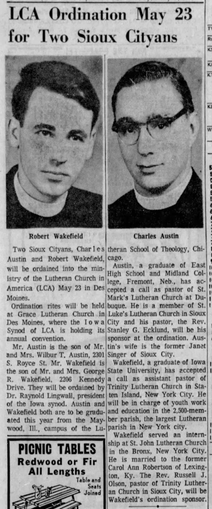 An article about John Wakefield’s brother Robert being ordained that was published in The Sioux City Journal on May 9, 1967.