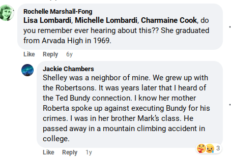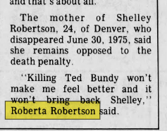 When Bundy was executed in January 1989 Roberta Robertson traveled from Colorado (she lived in the same house she raised her family in) to Florida and stood in a crowd of candle-holders outside the prison, waiting for word that he was officially dead. She told a journalist, “killing Ted Bundy won’t make me feel better and it won’t bring back Shelley. A lot of people seem to want it out of a vengeance. But it gives people a false sense of security. And it’s terribly expensive.” Mrs. Robinson passed away on September 23, 2009 in Lakewood, CO. Almost as tragic as Shelley’s murder, her brother Mark passed away at the age of 24 in a rock-climbing accident in 1979.
