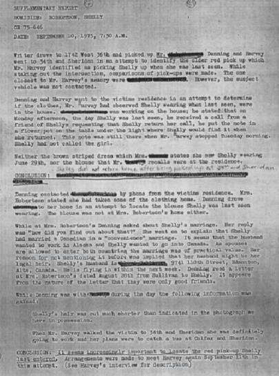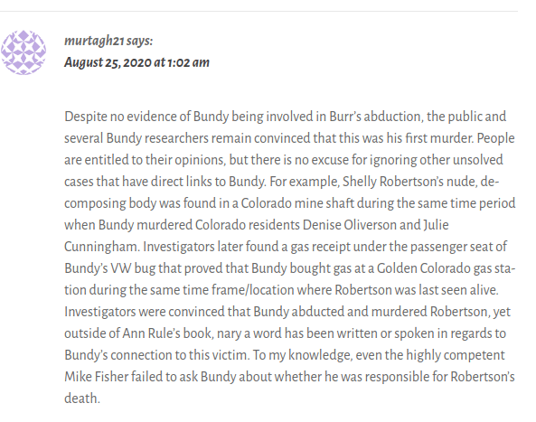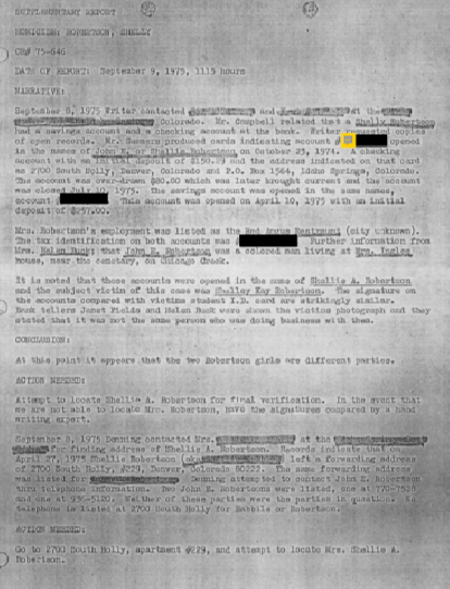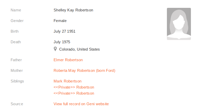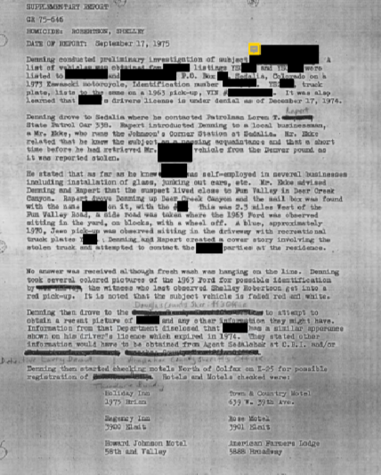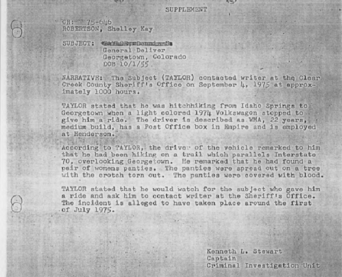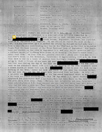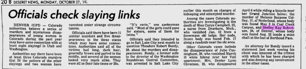 Shelley’s photo from the Arvada High School yearbook in 1967.Shelley’s photo from the Arvada High School yearbook in 1969.Shelley’s activities in the Arvada High School 1969 yearbook.Shelley’s graduation picture.Shelley Robertson.Shelley and her one time love (and my wonderful friend), JD Longwell. Shelley, photo courtesy of Gary Robertson/JD Longwell.A picture of Shelley napping with her guitar. Photo courtesy of JD Longwell.A picture of Shelley holding a really cute dog. Photo courtesy of JD Longwell.Shelley Kay Robertson. Photo courtesy of JD Longwell.A memorial plaque for Shelley and her brother, Mark. Photo courtesy of JD Longwell.Flowers left for Shelley. Photo courtesy of JD Longwell.An article mentioning Shelley published in The Deseret News on October 27, 1975.An article mentioning Robertson from the Greeley Daily Tribune published on October 27, 1975.An article mentioning Robertson from The News Tribune published on October 27, 1975.An article mentioning Robertson from the Logan Herald Journal published on October 27, 1975.An article mentioning Robertson from the Walla Walla Union Bulletin published on November 2, 1975.An article mentioning Robertson from the Tri-City Herald published on November 2, 1975.An article mentioning Robertson from The Albany Democrat-Herald published on November 14, 1975.An article mentioning Robertson from the Centralia Daily Chronicle on March 8, 1976.An article mentioning Shelley Robertson from the Colorado Springs Gazette Telegraph published on January 18, 1989.An article mentioning Robertson published by The Daily Sentinel on January 18, 1989.The portion of an article mentioning Mrs. Robertson published in The St. Lucie News Tribune on January 25, 1989.An article mentioning Robertson from the Daily Kent Stater on January 26, 1989.A short clipping mentioning Shelley from ‘The Hartford Courant’ after Bundy was executed.An aerial shot of Red Rocks Community College, where Shelley attended school.Berthoud Pass in Colorado.Berthoud Pass in Colorado.The logo for the Colorado School of Mines.Ted’s whereabouts when Shelley was abducted according to the ‘Ted Bundy Multiagency Investigative Team Report 1992.’The ‘Ted Bundy Multiagency Investigative Team Report 1992’ mentioning that Ted purchased gas in Golden, CO on April 4, 1975. A report mentioning police finding the remains of Shelley.Denise Oliverson went missing in Grand Junction on April 8, 1975; Cunningham was murdered On March 15th, 1975.A Facebook comment mentioning Shelley.A map of Bundy’s victims in Colorado; I’m not good at artsy stuff so please excuse my sloppy red arrow. This is Golden, where Shelley was abducted from. Shelley’s ‘myheritage’ page listing her family members.The only gas receipt I could find related to the Bundy case.The 1950 United States Federal Census record for Elmer Robertson. Mr. Robertson’s WW2 draft card.Elmer Robertson’s marriage certificate from his second marriage. His divorce from Shelley’s mom was finalized on December 6, 1971.Shelley’s brother Rick Robertson from the 1961 Arvada High School yearbook.Shelley’s brother Gary Robertson from the 1964 Arvada High School yearbook.Shelley’s brother Mark Robertson from the 1973 Arvada High School yearbook.Information related to Shelley Robertson’s murder investigation, courtesy of The King County Sheriff’s Department. Information related to Shelley Robertson’s murder investigation, courtesy of The King County Sheriff’s Department. Information related to Shelley Robertson’s murder investigation, courtesy of The King County Sheriff’s Department. Information related to Shelley Robertson’s murder investigation, courtesy of The King County Sheriff’s Department. Information related to Shelley Robertson’s murder investigation, courtesy of The King County Sheriff’s Department. Information related to Shelley Robertson’s murder investigation, courtesy of The King County Sheriff’s Department. Information related to Shelley Robertson’s murder investigation, courtesy of The King County Sheriff’s Department. Information related to Shelley Robertson’s murder investigation, courtesy of The King County Sheriff’s Department. Information related to Shelley Robertson’s murder investigation, courtesy of The King County Sheriff’s Department. Information related to Shelley Robertson’s murder investigation, courtesy of The King County Sheriff’s Department. Information related to Shelley Robertson’s murder investigation, courtesy of The King County Sheriff’s Department. Information related to Shelley Robertson’s murder investigation, courtesy of The King County Sheriff’s Department. Information related to Shelley Robertson’s murder investigation, courtesy of The King County Sheriff’s Department. Information related to Shelley Robertson’s murder investigation, courtesy of The King County Sheriff’s Department. Information related to Shelley Robertson’s murder investigation, courtesy of The King County Sheriff’s Department. Information related to Shelley Robertson’s murder investigation, courtesy of The King County Sheriff’s Department. Information related to Shelley Robertson’s murder investigation, courtesy of The King County Sheriff’s Department. Information related to Shelley Robertson’s murder investigation, courtesy of The King County Sheriff’s Department. Information related to Shelley Robertson’s murder investigation, courtesy of The King County Sheriff’s Department. Information related to Shelley Robertson’s murder investigation, courtesy of The King County Sheriff’s Department. Information related to Shelley Robertson’s murder investigation, courtesy of The King County Sheriff’s Department. Information related to Shelley Robertson’s murder investigation, courtesy of The King County Sheriff’s Department. Information related to Shelley Robertson’s murder investigation, courtesy of The King County Sheriff’s De
