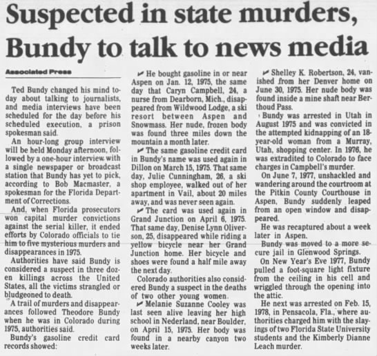 On April 6, 1975, Denise Oliverson set out on a bike ride to her parents house but was never seen alive again. The next day, a search party found her bicycle and shoes under the Fifth Street Bridge by some railroad tracks. Just days before he was executed in January 1989, Bundy told law enforcement he abducted Oliverson then disposed of her body in a river about five miles West of Grand Junction. Her remains have never been found.