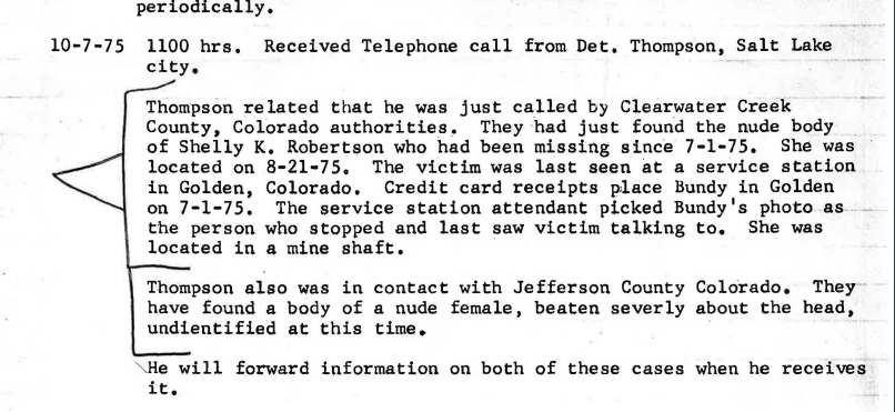 On June 27, 1975 (just a few days before Shelley was last seen), Bundy abducted and murdered Susan Curtis while she attended a youth conference at Brigham Young University in Salt Lake City. Four days after Robertson was last seen on July 4, 1975, Nancy Perry-Baird was abducted from the gas station where she worked in East Layton, UT and was never seen or heard from again. We know Bundy was quickly approaching the end of his reign of terror: he was pulled over by Utah State Trooper Bob Haywood on August 21, 1975 and was arrested for the possession of burglary tools, which eventually resulted in his arrest for the attempted kidnapping of CarolDaRonch.