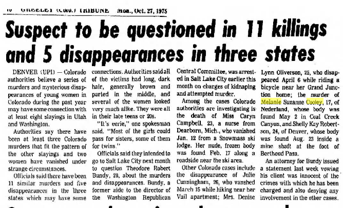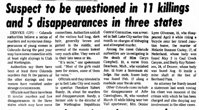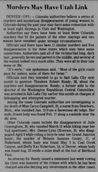 On November 13, 1975 a meeting was held in Aspen, Colorado for representatives of various police agencies from Washington, California, Utah, and Colorado to discuss cases of great similarities regarding homicides of young females occurring in these states.