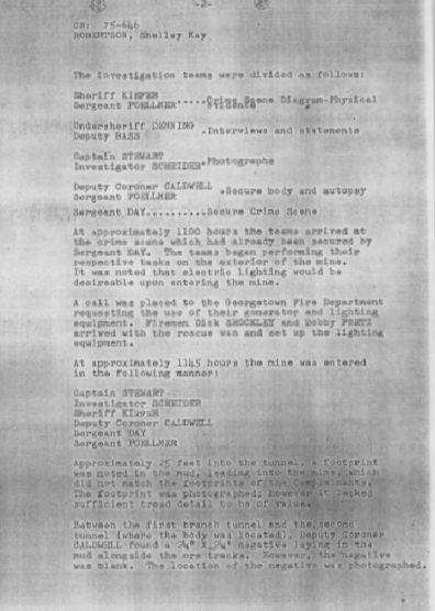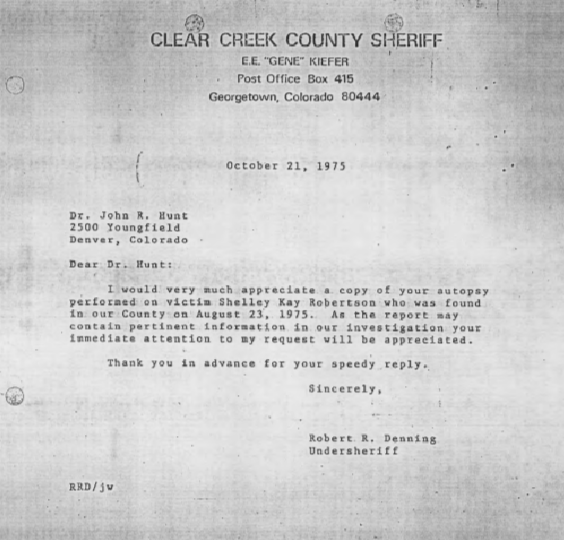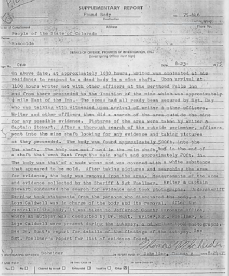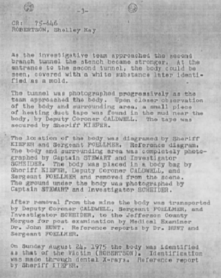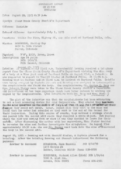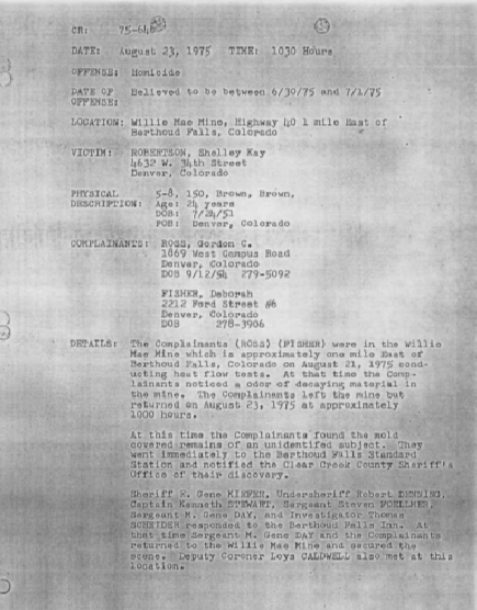 Days then weeks passed with no word from Shelley. On August 21, 1975 two students conducting Amex testing for gas content from the ‘Colorado School of Mines’ came across the body of Shelley Robertson in a mine in Berthoud Pass, Colorado near the Winter Park Resort. About 500 feet in they smelled something unusual: humandecomposition. Using their flashlights, they strained to see what was down the narrow tunnel, seeing something large and white. Upon further inspection they realized they were looking at a foot and “bare buttocks” and that “we’ve got body, lets get out of here.” They notified law enforcement and the Clear Creek County Sheriff’s returned on August 23 to find the naked, decomposing remains of Shelley Robertson discarded in the mine. Her body was ‘badly molded’ and bound with duct tape. Although it was determined she had been struck on the front side of the head, the top rear of the head, and the right side of her chest too much time had passed and because of the advanced levels of decomp forensic experts were unable to pinpoint the exact cause of death. Found at the scene were two torn pieces of furnace tape (one on the body and one discarded nearby) as well as discarded beer can and a plastic wrapper from a package of ham. Leads quickly ran dry.