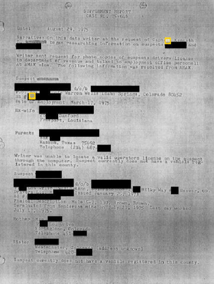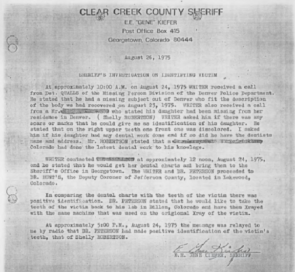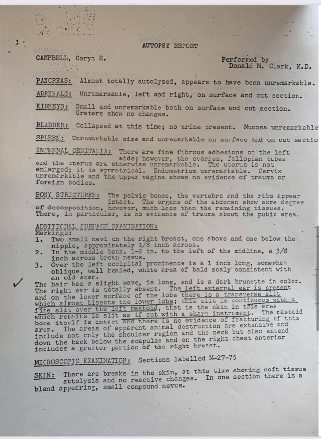 The day after the discovery was made the remains were taken to Denver General Hospital, where Pathologist Dr. Donald Clark performed an autopsy and a positive ID was made thanks to dental records.* Also, Caryn’s dentist determined that ‘in his unqualified opinion, after comparing the dental charts and x-rays with the dental work on the body, that the body is in fact Caryn Eilene Campbell.’ *Just as a side note, Kevin Sullivan reported that she was flown to ‘Howards Mortuary,’ located in Denver.