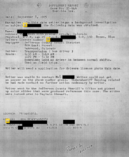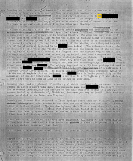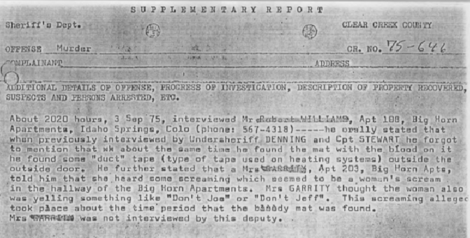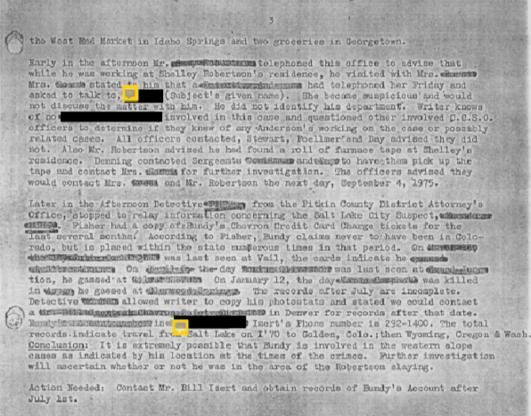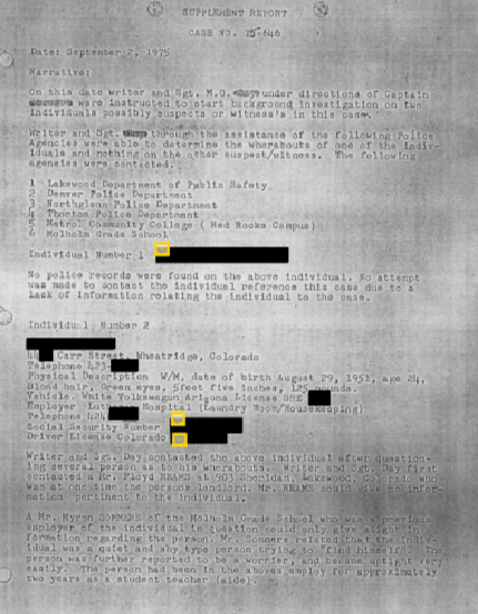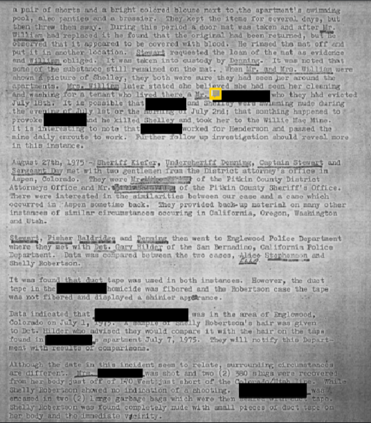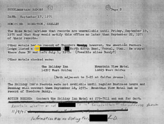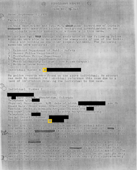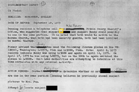 Grand Junction Police Department records related to the July 25, 1975 murder of Linda Benson and her five-year-old daughter, Kelly Ketchum. Their murders were only a small part of a much larger and ongoing crime spree in Grand Junction, CO that seemed to target individuals that knew too much about the region’s narcotics activities linked to corrupt law enforcement such as former police chief Ben Meyers. It was said that one of Linda’s neighbors reported to seeing a man that matched Ted Bundy’s description around the complex right before the murder took place.