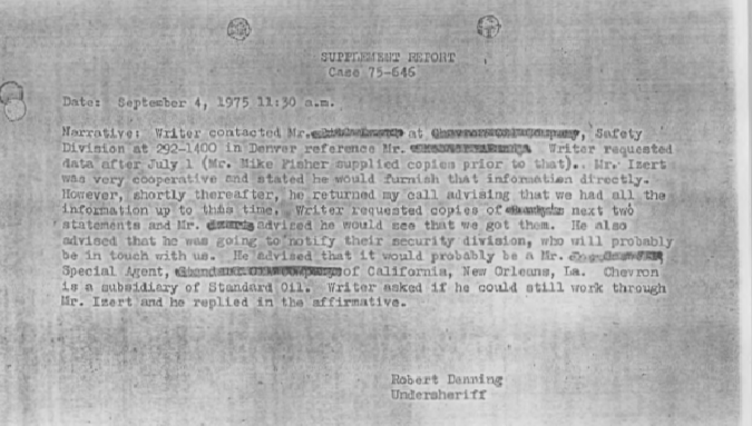 Mr. Williams remembered seeing what he thought was a bright yellow 1973 four-door Ford Maverick with a white stripe along the side. He also reported seeing a third man outside the gas station, who he described as being between 55 to 60 years old and very slender, with a full head of gray hair and overly prominent veins on his arms. The man went into the exterior men’s restroom and came out while he was still pumping his gasoline. Williams said the gentleman never went inside the station and after he filled up his gas tank gave his credit card to his son, who went inside and paid. He said that it takes about four to five minutes to drive to his house from the Fina station and he very clearly remembered being home before 5:30, which was exactly when his brother came over for a visit.