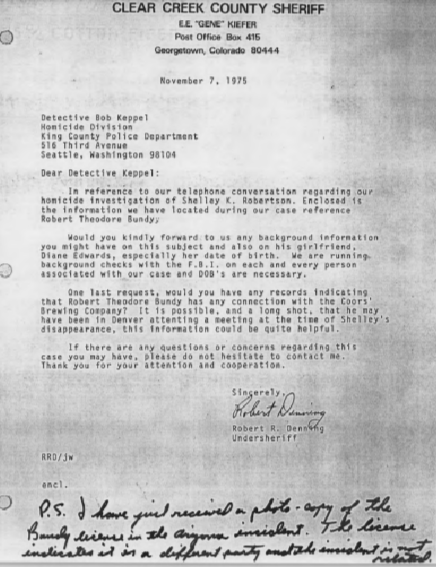 At some point when Bundy was incarcerated in Utah (he was transferred to Aspen, Colorado on January 28, 1977 to face charges for the murder of Caryn Campbell), former Cold Creek County Undersheriff Bob Denning traveled to Salt Lake City to interview him about the murder of Shelley Robertson. When the law enforcement officer asked him about her Ted is reported to have answered, ‘I don’t want to talk about that.’ Denning has commented that he is ‘99% sure that Shelley’s killer is Ted Bundy.’ Additionally, I read in multiple sources that Bundy confessed to Shelley’s murder before he was put to death however I can’t find it anywhere in the transcripts of his death row interviews.