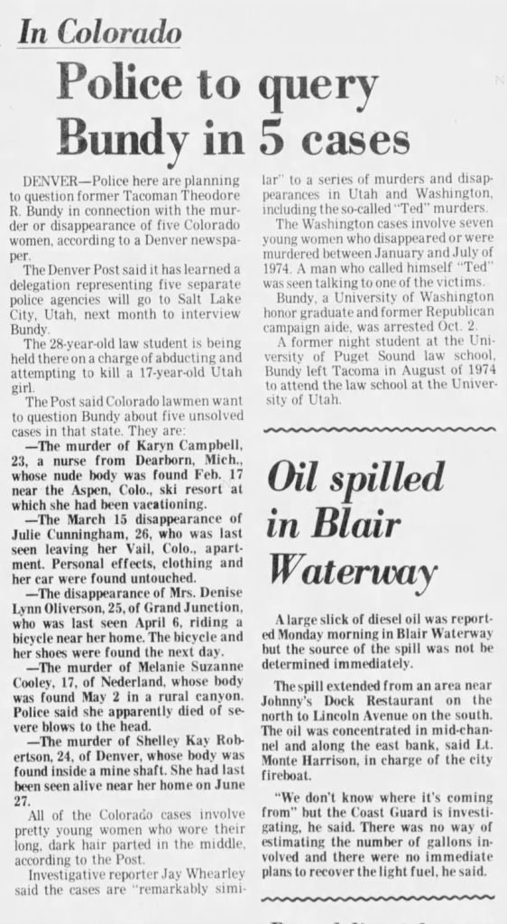 Curtis is Ted’s last confirmed victim until his escape in late 1977 (although there are some suspected/unconfirmed victims that disappeared after, including Sandra Weaver, Nancy-Perry-Baird, Shelley Kay Robertson, and Debbie Smith). Just a few days after Sue vanished on July 1, 1975 Shelley Kay Robertson was abducted from Golden, Colorado; her remains were found less than two months later on August 21 in a mine in Berthoud Pass. Four days after Robertson was last seen on July 4, 1975, Nancy Perry-Baird was abducted from the gas station where she worked in East Layton, UT and was never seen or heard from again. After Susan Curtis Bundy didn’t kill again until January 1978, when he escaped incarceration for the second time and escaped to Florida, and killed Lisa Levy and Margaret Bowman.
