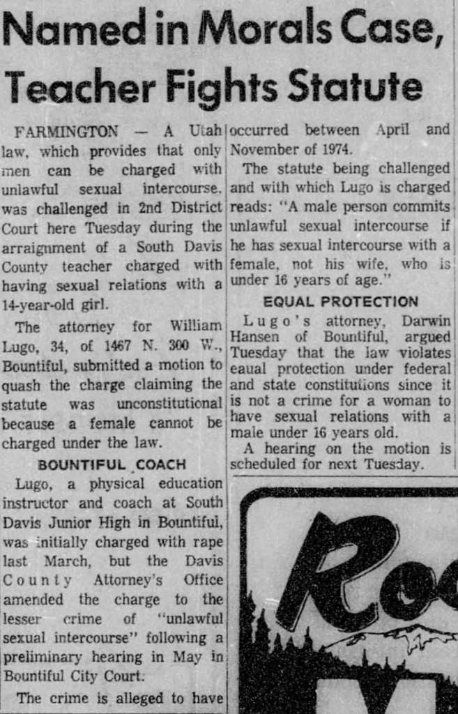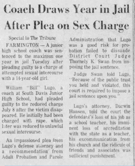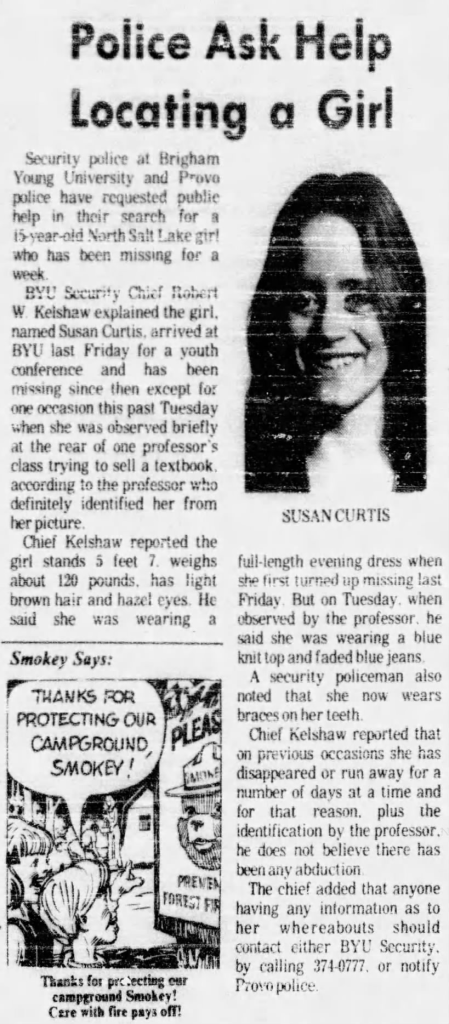 In the summer of 1975, SusanCurtis was fifteen and about to go into her sophomore year at Woods Cross High School. Due toan unhappy home life she had a history of running away, but she was never gone for very long and would always return home after just a few days. Sue hada lot of mental health concerns, and attempted suicide on a couple different occasions. She was also an ongoing victim of sexual assault at the hands of from a former physical education teacher and coach named William ‘Bill’ Lugo, who taught at South Davis Junior High School in north SLC (he was eventually convicted of his crimes)*. In an interview with true crime researcher Chris Mortensen (also known as Captain Borax), Lieutenant Arnold Lemmon from the Brigham Young University campus Police Department (and close friend of the Curtis family) said that Lugo and Sue ran away together the week before she was murdered. He even flew her to Phoenix and put her up in a hotel room. They got caught after Susan had a pregnancy scare and (using the fake name of a friend) arranged for her to go to a clinic and take a test (there was apparently a mix up and the results were mailed to that friend’s parents). He was eventually court ordered to stay away from the FOURTEEN year CHILD and in July 1975 was sentenced to a year in jail for his crimes. Lugo was initially charged with rape but pleaded guilty to the reduced charge of unlawful sexual intercourse. The defendant’s lawyer as well as the ‘Adult Probation and Parole Administration’ both said that the teacher was a good fit for probation, and that he suffered sufficient punishment in the form of his loss of accreditation as a teacher, excommunication from his church, and derision of friends and associates. Thankfully this wasn’t enough to dissuade District Court Judge Thornley K. Swan from imposing the maximum allowed jail sentence: ‘because of the public trust you held and violated, this court is required to impose a jail sentence upon you.’ It’s been reported that the entire experience was pretty traumatizing to Sue, and because of the ‘relationship’ she suffered from a lot of behavioral health issues.