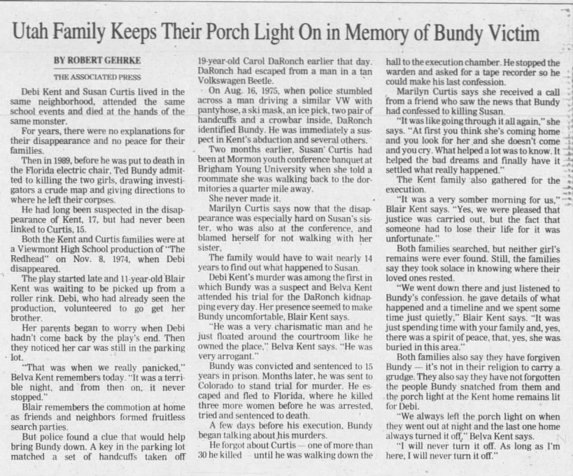 At the time she was murdered, Susan was a freshman at Woods Cross High School. She had a history of running away from home for days at a time but never was gone for very long. Susan was originally from Bountiful, Utah but at the time of her disappearance was attending a youth conference at Brigham Young University in Provo. A natural athlete, Curtis had ridden her bicycle 50 miles from Bountiful to Provo to attend the conference. She vanished on the first evening of the conference after a formal banquet: she left her friends to make the quarter mile walk back to her dormitory to brush her teeth but was never seen or heard from again. As Bundy walked down to the hall to be executed Curtis was his last death row confession. Since her body has not been recovered she is still regarded as a missing person.