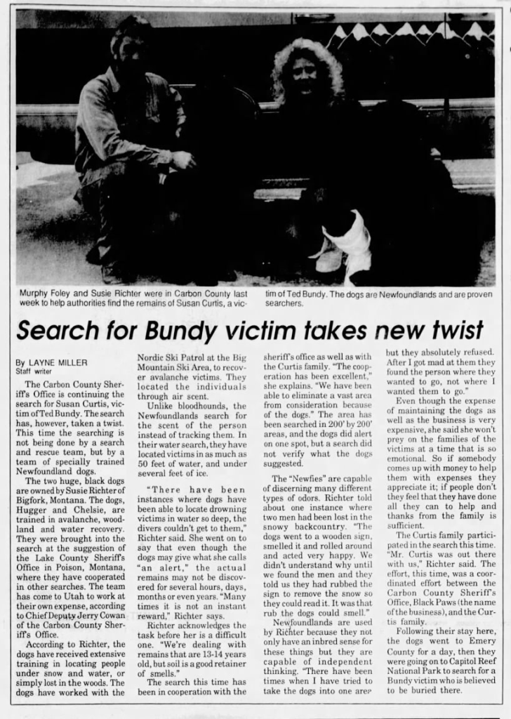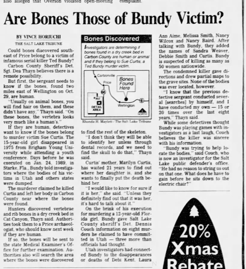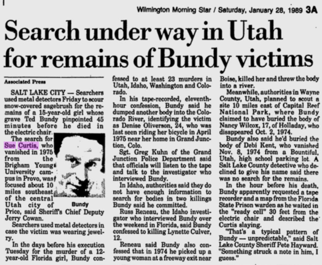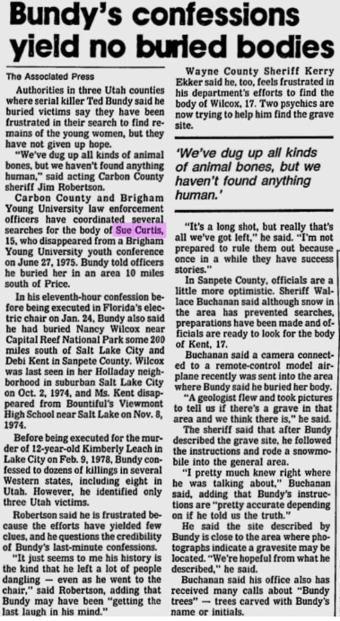 Sue Curtis.Susan Curtis in a group picture from the 1972 South Davis Junior High School yearbook.Sue in a group photo from junior high. Photo courtesy of ‘TB: I was Trying to Think Like an Elk.’ And thank you to Samantha Shore for finding this for me.Sue in a group photo from junior high. Photo courtesy of ‘TB: I was Trying to Think Like an Elk.’ And thank you to Samantha Shore.Sue in a group photo from junior high. Photo courtesy of ‘TB: I was Trying to Think Like an Elk.’ And thank you to Samantha Shore.Sue Curtis’ freshman year picture from the 1975 Woods Cross High School yearbook.Susan in a group picture for the baseball team from the 1975 Woods Cross High School yearbook.Susan in a group picture for the volleyball team from the 1975 Woods Cross High School yearbook.An article about Curtis published by The Daily Herald on July 4, 1975 (which is coincidentally the same date that Nancy Perry-Baird disappeared on).An article mentioning Curtis published by The Deseret News on September 8, 1978.A list of some potential victims of Bundy that mentions Curtis published by The Salt Lake Tribune on January 25, 1989.AAn article mentioning Curtis published by The Idaho Statesman on January 27, 1989.Part one of an article mentioning Curtis published by The Salt Lake Tribune on January 27, 1989.Part two of an article mentioning Curtis published by The Salt Lake Tribune on January 27, 1989.An article mentioning Curtis published by The Spartenburg Weekly Herald on January 28, 1989.An article mentioning Curtis published by The Wilmington Morning Star on January 28, 1989.An article mentioning Curtis published by The Knoxville News-Sentinel on January 29, 1989.An article mentioning Curtis published by The Ukiah Daily Journal on January 29, 1989.An article about the search for Susan Curtis published by The Daily American Republic on January 29, 1989.A newspaper blurb mentioning Curtis published by The Times-Independent on February 9, 1989.An article about the hunt for Curtis published by The Sun-Advocate on February 14, 1989.Part one of an article mentioning Curtis published by Newsday (Suffolk Edition) on February 23, 1989.Part two of an article mentioning Curtis published by Newsday (Suffolk Edition) on February 23, 1989.A ‘thank you’ note written to the investigators that worked Bundy’s case that mentions Susan Curtis, published by The Sun-Advocate on March 16, 1989.An article about the search for Susan Curtis published by The Salt Lake Tribune on March 22, 1989.An article mentioning Curtis published by The Lakeland Ledger on April 25, 1989.An article about the search for Susan’s remains published by The Salt Lake Tribune on November 9, 1996.An article mentioning Curtis published by The Salt Lake Tribune on August 19, 2000.A professor from BYU reported that he had seen Sue trying to sell a textbook at the back of his class. This false sighting, paired with her habit of running away initially made the police wonder if she left willingly and that no abduction had taken place. Photo courtesy of OddStops.The Curtis family’s page on ‘MyHeritage.’ It looks like it’s run by a Marilyn Curtis.An x-ray of the skull of Susan Curtis from when she got her braces. Photo courtesy of Captain Borax.Another shot of an x-ray of the mandible of Curtis. Photo courtesy of Captain Borax.An x-ray of the mandible of Curtis. Photo courtesy of Captain Borax.The notes on an x-ray of Susan Curtis. Photo courtesy of Captain Borax.The missing persons report for Susan Curtis completed by her sister Barbara. Photo courtesy of Captain Borax.An aerial shot of Brigham Young University in 1974. Photo courtesy of Captain Borax.The Wilkinson Student Center in the 1960’s. Photo courtesy of Captain Borax.The Wilkinson Center Cafeteria in the 1960’s. Photo courtesy of Captain Borax.This is a Google Street View image of the Wilkinson Student Center at Brigham Young University. Helaman Halls. Photo courtesy of OddStops.The Wilkinson Student Center at BYU.The set-up of the Helaman Hall group of dorms at Brigham Young University. Photo courtesy of Captain Borax.Merrill West Hall. Photo courtesy of Captain Borax.The Curtis family home at the time Sue disappeared, located at 73 South 250 East North in Bountiful outside of SLC. After she was abducted the family relocated to Wellington, Utah for employment reasons.Woods Cross High School, where Curtis was a student.Bountiful’s ‘Orchard Youth Ward,’ in the northern part of Salt Lake City located at 3599 South Orchard Drive.The route from Bundy’s apartment on 1st Ave in SLC to the Wilkinson Student Center at BYU.This is an aerial image that shows the three possible routes that Curtis may have taken the evening she vanished. Google Maps shows that the orange one is the preferred one, but this may not have been the case back in the summer of 1975. We also have to remember that Curtis wasn’t a student at the University and wasn’t very familiar with the campus. All of these routes are roughly the same length and because of this, there is no way of knowing which one she took. Photo courtesy of OddStops.This is an aerial photograph of the BYU campus taken in September 1969. The Wilkinson Student Center is circled in blue, and the red circle highlights the dorm building that Curtis was planning on walking to the night she was abducted. Some of the parking lots in the area are marked with yellow X’s. Photo courtesy of OddStops.Where Bundy abducted Curtis from and where he claims he dumped her remains. Photo courtesy of OddStops.Joe Ruden from the Carbon County Search and Rescue team uses a metal detector to search for the remains of Susan Curtis. Jim Simone from the Carbon County Search and Rescue team sets out in search for the remains of Sue Curtis.Investigators spent three weeks fruitlessly scratching the frozen earth outside of Price. Picture published in Newsday (Suffolk Edition) on February 3, 1989.Bundy’s whereabouts the day Curtis disappeared accordin