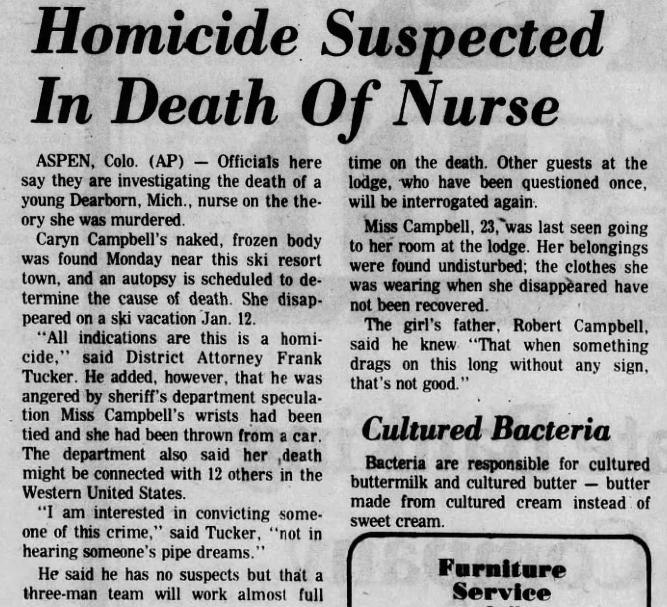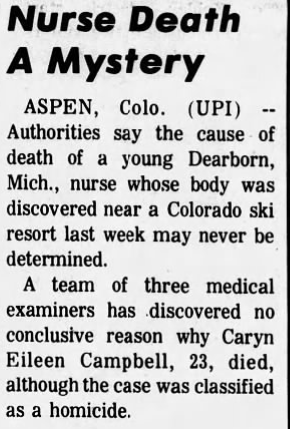 Caryn Campbell (23). January 12, 1975. Murdered, Estes Park, CO.