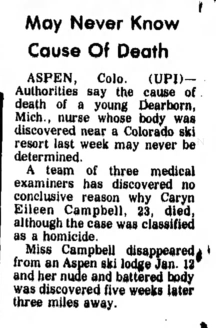 Caryn Campbells sophomore year picture from the 1967 Dearborn High School yearbook.Caryn Campbells junior year picture from the 1968 Dearborn High School yearbook.Caryn Campbells senior year picture from the 1969 Dearborn High School yearbook.A picture of Caryn that was published in The Ann Arbor News on February 19, 1975.Caryn Campbell.Campbell.Caryn Campbell.Caryn and a family member.Campbell’s drivers license.A shot of the remains of Caryn Campbell lying in the snow. Photo courtesy of Vanessa West.Vince Lahey holding a crowbar over Campbells autopsy photo. Photo courtesy of Erin Banks.The skull of Caryn Campbell. Photo courtesy of Vanessa West.Thank you to my friend Samantha Shore for letting me know the identity of this victim.The Stew Pot restaurant, where Caryn dined before she was killed by Bundy.A sign for The Stew Pot, where Caryn had dinner with Dr. Gadowski and her kids the night that she was abducted and murdered.A picture of The Wildwood Inn, taken in the 1970’s.A sign for The Wildwood Hotel (formerly Inn) located in Snowmass Village, Colorado. I’m shocked at how squished together everything is, I imagined this beautiful, sprawling hotel… but it was all so close together. 2/10, would not recommend.The Wildwood Hotel (formerly Inn), where twenty-three-year-old Michigan nurse Caryn Campbell was staying with her fiancé when she disappeared on January 12, 1975; her body was found on February 17, 1975, less than three miles away on the side of Owl Creek in the outskirts of Aspen. Picture taken in March 2025.A picture of how Room 210 at The Wildwood Inn looked in the 1970’s. Photo courtesy of Chris Mortensen, 2016.This is the GPS coordination’s where Caryn Campbells remains were discovered on Owl Creek Road in Aspen. Picture taken in March 2025.An aerial image of the area where a local worker discovered Campbell’s frozen remains located exactly 3.1 miles away from The Wildwood Inn in Snowmass Village. Photo courtesy of OddStops.A sign for the entrance of The Wildwood Inn as it looked in the 1970’s.The entrance of The Wildwood Inn as it looked in the 1970’s.The hallway at The Wildwood Inn leading to room 210 that Caryn walked down the evening she was abducted.The pool area of The Wildwood Inn.One of the parking lots on the western side of The Wildwood Inn. Photo courtesy of OddStops.Bundy had a number of parking lots to choose from. Once Campbell agreed to help him, it would have been a relatively short walk to his vehicle. This would explain why she seemingly vanished into thin air. Photo courtesy of OddStops.The layout of rooms at The Wildwood Inn, taken from Detective Kathy McChesney’s notes.The layout of The Wildwood Inn, taken from Detective Kathy McChesney’s notes.The temperatures in Snowmass Village on January 12, 1975.The temperatures in Snowmass Village in January 1975.The temperatures in Snowmass Village in February 1975.An article about the disappearance of Caryn Campbell published in The Aspen Times on January 23, 1975.An article about the disappearance of Caryn Campbell published by The Ann Arbor News on January 25, 1975.Part one of an article about the disappearance of Caryn Campbell published in The Detroit Free Press on January 25, 1975.Part two of an article about the disappearance of Caryn Campbell published in The Detroit Free Press on January 25, 1975.An article about the disappearance of Caryn Campbell published in The Battle Creek Enquirer on January 26, 1975.An article about the disappearance of Caryn Campbell published in The Gallup Independent on January 27, 1975.A newspaper article about the discovery of the remains of Caryn Campbell published in The Ann Arbor News on February 19, 1975. An article about the discovery of the remains of Caryn Campbell published by The Bay City Times on February 19, 1975.An article about the murder of Caryn Campbell published in The Detroit Free Press on February 19, 1975.A newspaper article about the murder of Caryn Campbell published in The Ann Arbor News on February 20, 1975.An article about the murder of Caryn Campbell published in The Detroit Free Press on February 20, 1975.The obituary of Caryn Campbell published by The Detroit Free Press on February 20, 1975.A newspaper article about the discovery of Caryn Campbell published in The Kalamazoo Gazette on February 26, 1975.An article about the death of Caryn Campbell published in The Petoskey News-Review on February 27, 1975.An article about the murder of Caryn Campbell published by The Petoskey News-Review on February 27, 1975.Part one of an article about the murder of Caryn Campbell published in The Jackson Citizen Patriot on May 25, 1975.Part two of an article about the murder of Caryn Campbell published in The Jackson Citizen Patriot on May 25, 1975.An article about Ted Bundy that mentions Caryn Campbell published in The Greeley Daily Tribune on October 27, 1975.An article about Ted Bundy that mentions Caryn Campbell published in The Greeley Daily Tribune on October 31, 1975.An article about Ted Bundy that mentions Caryn Campbell published in The Daily Sentinel on November 2, 1975.An article about Bundy being investigated for the death of Caryn Campbell published in The Jackson Citizen Patriot on February 23, 1976.An article about Ted Bundy being charged for the murder of Caryn Campbell that was published in The Ironwood Daily Globe on February 23, 1976.An article about Ted Bundy that mentions Caryn Campbell published in The Herald-Palladium on October 23, 1976.A newspaper blurb about Ted Bundy that mentions Caryn Campbell published in The Ann Arbor News on November 26, 1976.An article about Ted Bundy that mentions Caryn Campbell published in The Jackson Citizen Patriot on November 26, 1976.An article about Ted Bundy that mentions Caryn Campbell published in The Flint Journal Flint on November 28, 1976.An article about Ted Bundy being charged with the murder of Caryn Campbell published in The Herald-Palladium on November 30, 1976.An article abou