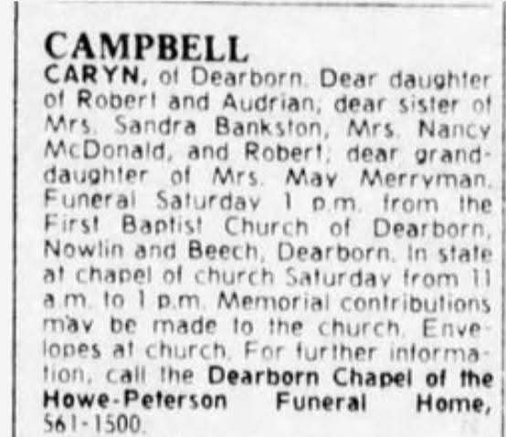 Audrian Campbell passed away at the age of 67 on March 10, 1986 in Detroit, and Mr. Campbell died at the age of 79 on July 28, 1996. Caryn’s sister Sandra Lee ‘Sandy’ Leabo died on September 27, 2017 in Northport, MI and Nancy Ann passed away at the age of eighty in Wyandotte on January 5, 2023.