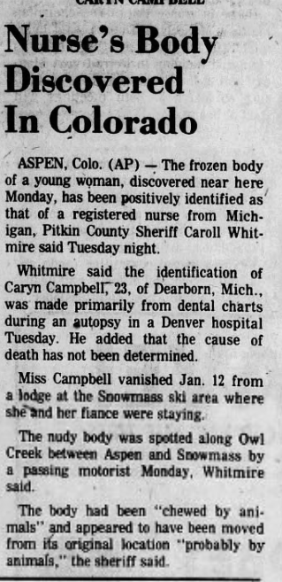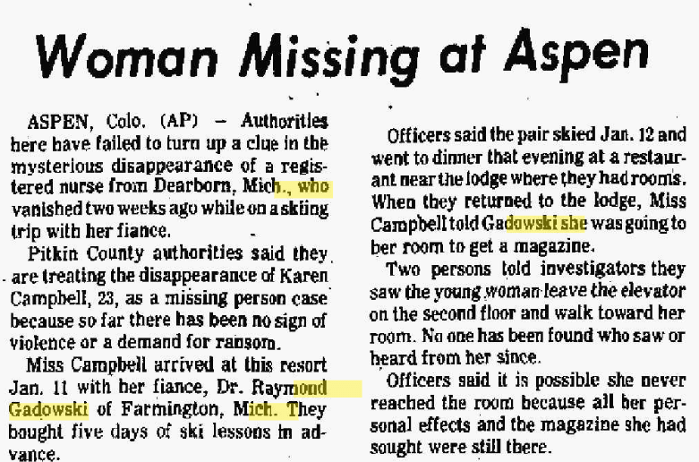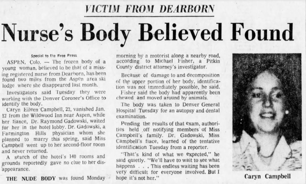 Almost immediately after her body was discovered Dr. Gadowski was interviewed by a reporter, and regarding the tentative identification, he said, ‘that’s kind of what we expected. We’ll have to wait and see what happens… This endless waiting has been very difficult for everyone involved. But I hope it’s not her.’ After a positive identification was made, Caryn’s remains were flown to Detroit for burial. In February and March 1975 Pitkin County investigators traveled to Michigan on multiple occasions in order to dig into Campbell’s background (as well as Dr. Gadowski and Dr. Rosenthals’).