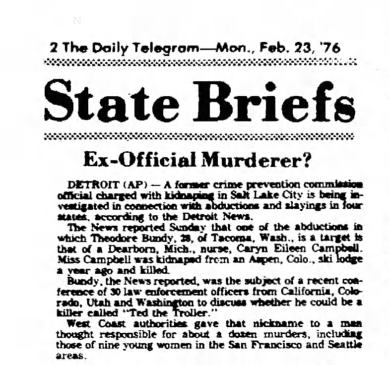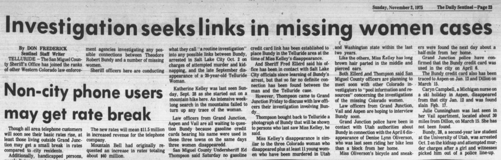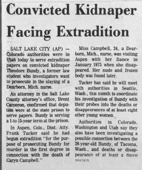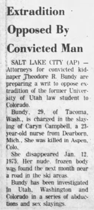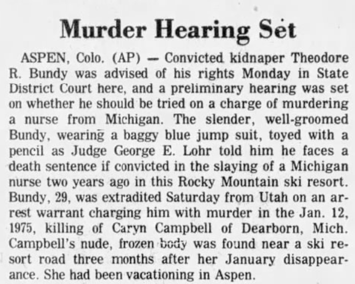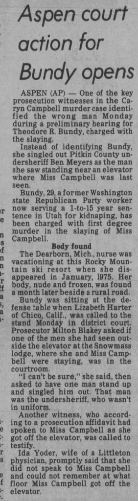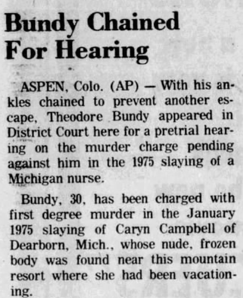 When Campbell disappeared it was well past sunset, and weather conditions had dropped significantly: according to historical records, the temperature in Snowmass Village on the evening of January 12, 1975 hovered around -2, therefore it stands to reason that the lot where Bundy parked his car was pretty deserted and absent of any people lingering. Additionally, in the days following her disappearance conditions were below freezing, and by January 15th detectives were fairly certain that the young nurse hadn’t left Colorado by any form of commercial transportation (plane, train, or bus). They also had checked out all of the area’s medical facilities and hotels/inns/resorts, and no unnamed young woman that matched Caryn’s description had been admitted or checked in. Airports and bus companies around the general Aspen area were notified of the missing young woman, and were given photos and a description of her (Sullivan, 159).