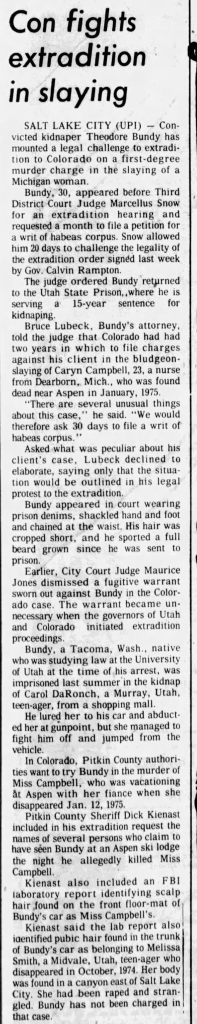 On October 21, 1976 Ted was officially charged by Pitkin County for the murder of Caryn Campbell, and on January 28, 1977 he was transferred from custody in SLC to the Garfield County Jail in Glenwood Springs to stand trial. Once again, he decided to act as his own attorney, which allowed him access to the make-shift ‘law library’ located in the back of the second story courtroom, which he escaped from on June 6, 1977, and the rest is history… (in reality, I’ve already written about it a half dozen times before).