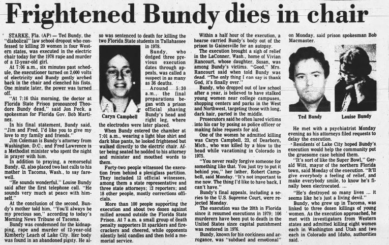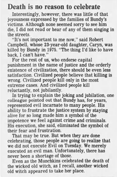 The day before the execution of his daughter’s killer, Robert Campbell did an interview with The Free Press, saying: ‘you never really forgive something like that. You just try to put it behind you… the thing I’d like to have back, I can’t.’ He went on to say that despite Caryn’s senseless murder that he didn’t feel strongly one way or another when it came to capital punishment, and that he was ‘not a vindictive person, but certainly you can’t go around killing people… reluctantly, but I don’t think executing Bundy will be a deterrent. People will keep killing.’