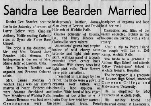 Sue was a strong student and while she was attending Palos Verdes Peninsula High School in Los Angelas she was in Spanish Club, Advanced Girls Ensemble, and concert choir. After she graduated in 1973 she relocated to Salt Lake City and enrolled in Brigham Young University. Susanne married LeRoy Crawford on May 23, 1975 in their temple in SLC and the couple had four children together: Kristi , Jaden, Glen, and David. Leroy Dalley Crawford was born on November 9, 1949 in Summit, Utah.