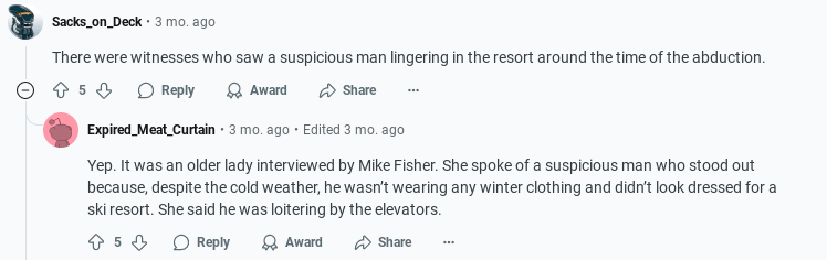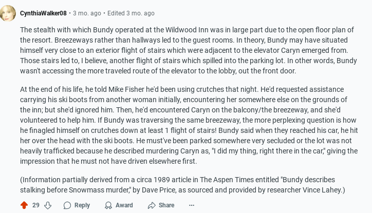 According to Kevin Sullivan’s 2016 book, ‘The Trail of Ted Bundy,’ a woman named Elizabeth Harter (who I’ve also seen called Lisbeth) was staying at The Wildwood Inn at the time of Caryn’s murder, and she said the evening she disappeared she happened to notice Ted standing next to a ‘outdoor service closet’ and across from an elevator because he looked so out of place, saying that he: ‘certainly wasn’t dressed for it (meaning the cold temperatures), as he was wearing dress slacks and a shirt. His appearance looked so odd that Elizabeth Herter noticed him and immediately wondered why he would be doing such a thing. He stood out, she later told police investigators, and she thought it was weird.’
