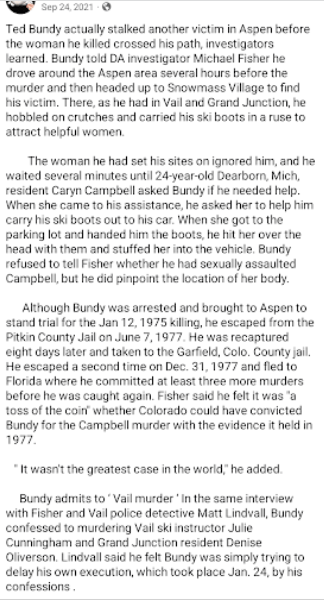 And Bundy then says that he believed Fisher also traveled back to Michigan, to the area where Caryn Campbell was from, and that Bundy’s discovery records indicated that Fisher sent out hundreds of letters to different law enforcement agencies inquiring about the Campbell case… ‘Many many letters to agencies followed up the lead on different suspects. No question he was chief investigator and he engaged in enormous amount of work in that case, both before and after the time I became a suspect. This portion should be reflected in many of the documents I collected in Colorado. So one cannot fault him for being diligent, being amateurish but diligent in pursuit of solving the Caryn Campbell murder.’
