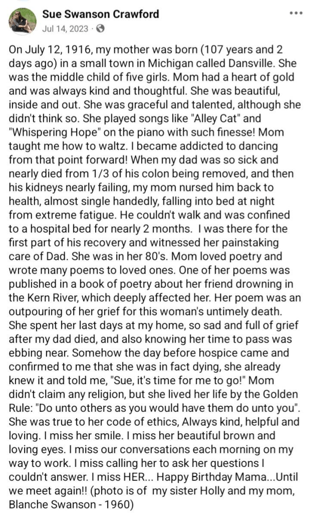 Susanne and her mother, Blanche.Sue and her father Herb poising together with a horse.Blanche Swanson and her two daughters, Holly and Sue.Susanne’s sophomore year picture from the 1971 Palos Verdes Peninsula High School yearbook.Susanne’s junior year picture from the 1972 Palos Verdes Peninsula High School yearbook.A picture of Susanne in a group shot for girls choir ensemble from the 1972 Palos Verdes Peninsula High School yearbook (she is in the top row ion the far right).Susanne’s senior year picture from the 1973 Palos Verdes Peninsula High School yearbook.Crawford.Crawford on her 1973/1974 student ID card at Brigham Young University.A photo of Sue in front of Dixie State University.Sue.Leroy and Sue in the list of people that applied for marriage licenses published in The Daily Herald on May 12, 1975.The announcement of one of Sue and Leroy’s children published in The Salt Lake Tribune on February 14, 1983.The announcement of one of Sue and Leroy’s children published in The West Valley View: The Green Sheet on February 17, 1983.A FB post Sue made for what would have been her father’s 99th birthday.A FB post Sue made for what would have been her mother’s 107th birthday.A FB post Sue made for what would have been her father’s 99th birthday.Bundy’s whereabouts in August 1975 according to the ‘1992 FBI TB Multiagency Report.’ Notice he was apprehended on August 16th so this would make me think if Crawford’s enocunter did happen it was in the first hald of the month. Ted’s first apartment located at 565 1st Ave in SLC, where he was living at the time Sue claims she had her encounter with the killer.Sue Curtis, who was never seen or heard from again after she left the Wilkenson Student Center at BYU to go back to her room during a youth conference.Bundy’s whereabouts on June 27, 1975 when Sue Curtis was abducted from BYU according to the ‘1992 FBI TB Multiagency Report.’The outside of the Wilkinson Student Center at Brigham Young University. Picture courtesy of OddStops.The outside of the Wilkinson Student Center at Brigham Young University. Picture taken in November 2022.The route from Bundy’s apartment on 1st Ave in SLC to the Wilkinson Student Center at BYU.An announcement that LeRoy Crawford was Christened published in The Parowan Times on December 9, 1949.Leroy Dalley Crawford.A picture of Leroy Crawford driving a bus, an occupation Sue said he did for many years.The Magna Times on December 18, 1980.Sue’s ex-husband, Leroy Dalley Crawford.LeRoy’s obituary.A comment Glen Crawford left on his fathers Legacy page.The final resting place of LeRoy Dalley Crawford.Herbert Clarence Swanson’s WWII draft card.Sue’s father, Herb.Sue’s mother, Blanche.Herb Swanson. Blanche Ethel Haynes.Herbert and Blanche Swanson, 1938 versus 1985.Holly Swanson’s freshman year picture from the 1975 Palos Verdes Peninsula High School yearbook.Sue’s mother Blanche.Sue’s four children: Jaden, Glen, Dave, and Kristi at Glen’s wedding in 2009.