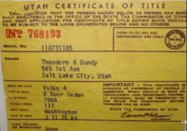 On September 17, 1975, in an attempt to ditch the vehicle to keep it out of the hands of the Salt Lake County Sheriff’s Department (who were interested in searching it for evidence linked with his multi-state murder spree), Ted Bundy sold his beige 1968 Volkswagen sedan to eighteen-year-old Bryan Severson: titled ‘Bill of Sale’ and written on what appears to be a yellow legal pad, the receipt is hand-written in red ink and states that on that date, Bryan Severson ‘has bought and paid for in full the sum of $800 (eight hundred dollars),’ signed Theodore R. Bundy. Hairs from three of Bundy’s victims were later found in the VW, according to reports. Bryan was born on February 5, 1958 and currently lives in Bountiful, Utah. Over the years Severson’s memory may have gotten a bit hazy in regards to the encounter: in October 2022 he did an interview with true crime researcher Chris Mortenson, who said that Bundy immediately ‘took off’ after he paid him for that car, but in a different interview conducted in front of Ted’s rooming house, he said he had driven Ted back to his rooming house after the purchase was completed… so, who knows? Interesting fact: he went to the same high school as Melissa Smith, and was a year below her.