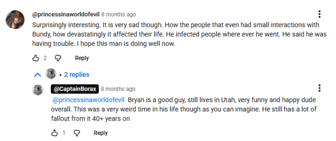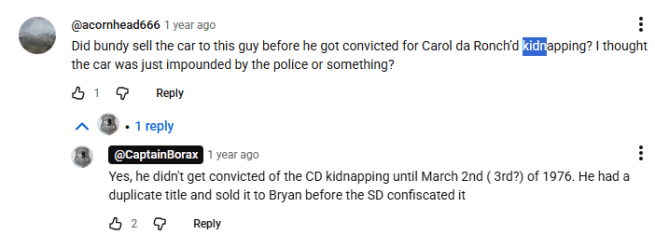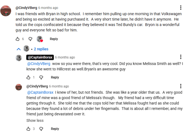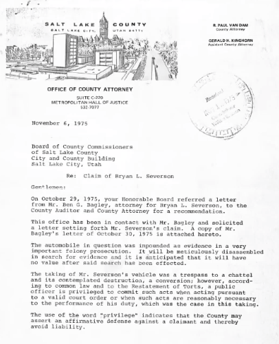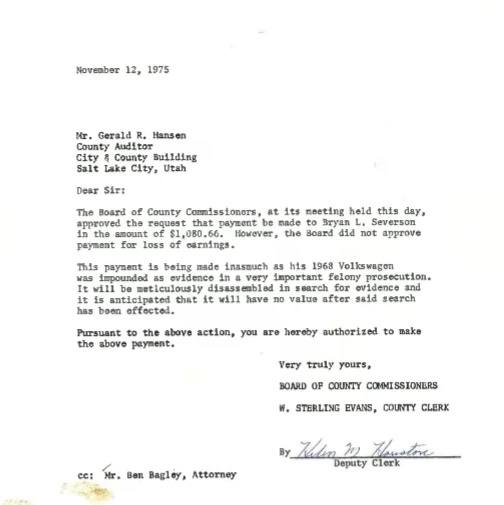 Bryan Severson.Bryan Severson from the 1974 Hillcrest High School yearbookBryan Severson as he looks today.Severson in front of Bundy’s former rooming house.The title for Bundy’s Volkswagen.Bundy’s car listed for sale in The Deseret News on September 10, 1975.Some notes related to Bryan Severson. A letter to the Board of County Commissioners of Salt Lake County dated November 6, 1975 in relation to the transaction Bundy made with Bryan Severson. A letter dated November 12, 1975 from W. Sterling Evans, County Clerk of the Board of County Commissioners to Gerald R. Hansen, Salt Lake County Auditor in regards to the money Bryan Severson lost after his new car was impounded and taken from him.A subpoena to testify issued to Bryan Severson in relation to Ted’s murder trial in Aspen, CO (he never had to report, he had escaped and was in Florida by the time January 4, 1978 rolled around).Ted’s VW after he was incarcerated.A comment left on Chris Mortenson’s YouTube video on Bryan Severson.More comments left on Chris Mortenson’s YouTube video on Bryan Severson.More comments left on Chris Mortenson’s YouTube video on Bryan Severson.More comments left on Chris Mortenson’s YouTube video on Bryan Severson.Where Severson lived at the time he bought Bundys car, located at 1161 East Serpentine Way in Sandy, Utah.