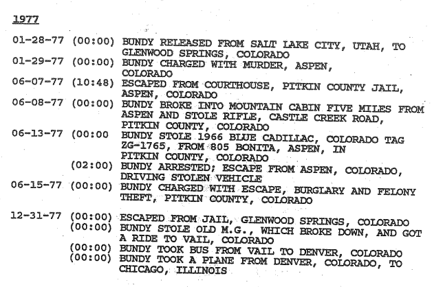 If I can be candid, I think Mrs. McNair is mistaken in her identification of Ted Bundy that night in Boulder in late 1977: by that time his movements were incredibly well documented and tracked (as he was in police custody for most of the year), and in total was technically only ‘free’ for a total of seven days (although only one can really be considered as six of the seven days were in June). According to the ‘1992 FBI TB Investigative Report,’ from January 1-29, 1977 he was incarcerated in the Utah State Prison, and from January 29th to April 11, 1977 he was in the Pitkin County Jail; from April 11th to June 7th he was in the Garfield County Jail (with the occasional overnight trip to the Pitkin County Jail). Let’s not forget his daring escape where he was free between June 7th to the 13th, and after he was recaptured he was sent back to the facilities in both Garfield and Pitkin Counties until his second escape early in the morning on December 31, 1977… so unless McNair’s encounter happened on New Years Eve, (which one would think is a pretty memorable day), then it was most likely not Ted Bundy that needed car help. Also he was not said to have been in Boulder that day, only Glenwood Springs, Vail, and Denver; from there he took a plane to Chicago.