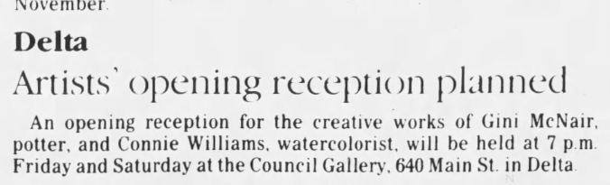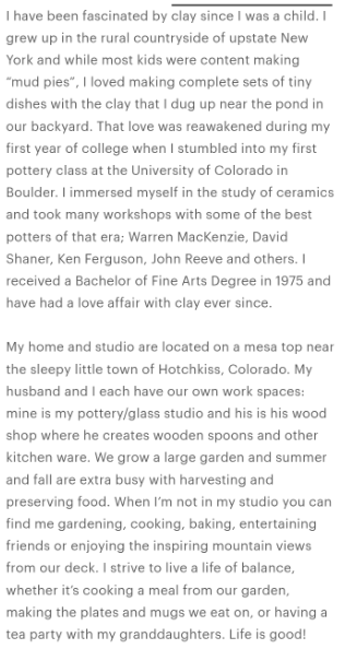 Gini is an established artist and ceramicist that has over forty-five years of experience in her field (she also makes fused glass jewelry); she has a physical storefront with her husband called ‘McNair Studios’ and most days you can find them in their respective studios or outside working in their garden. She opened ‘Fat Cat Pottery’ in Grand Junction (which is still open as of December 2025), which is described as a ‘successful, next door, do-it-yourself pottery studio,’ and has multiple storefronts across the internet (I was able to easily find her Etsy page). Bob is retired from a successful career of the field of custom home construction, and he now creates hand carved wooden spoons; in August 2006 the couple opened a coffee shop called ‘Doghouse Espresso.’ When she is not creating her art Gini enjoys gardening, spending time with her daughter and granddaughter, cooking, baking, entertaining friends, and enjoying the inspiring mountain view from her deck. I was unable to find anything related to McNair after 2021 online, and her Etsy shop is currently closed.