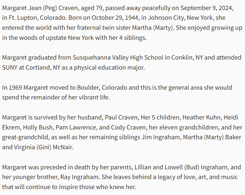 Mr. Ingraham died at the age of seventy-four on March 7, 1990 in Boulder, Colorado after a sudden illness. According to his obituary, he retired in 1972 and was a member of the Nederland Presbyterian Church and was active in the Nederland Lions Club as well as several other groups aimed for senior citizens, and in his spare time enjoyed gardening, fishing, and photography. Lillian Marie Ingraham died at the age of ninety-one on September 2, 2009 in Boulder. Gini’s brother Raymond Charles Ingraham passed away suddenly at the age of sixty-four on June 20, 2013; her sister Margaret Jean (Peg) Craven died at the age of seventy-nine on September 9, 2024, in Fort Lupton, Colorado.