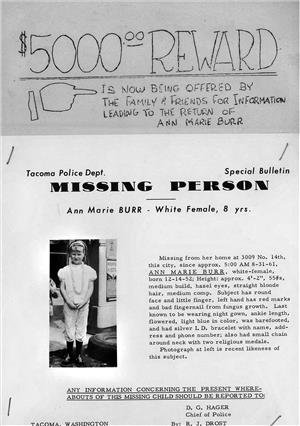 The cozy bungalow Bev once thought of as her dream home quickly became her biggest nightmare, but she felt she had to stay there in case Ann ever came home. When the family moved into a large colonial on North 28th Street in Tacoma six years to the month after Ann’s disappearance, they published the new address and phone number in the local newspapers in hopes Ann Marie would one day find her way back to them. Some of Ann’s clothes and toys made their way to the new residence. However, this led to many prank calls and a lot of harassment. Beverly received a phone call on February 20, 1964 from a man who sounded young but well-spoken and polite with no distinguishable accent. He claimed that Ann Marie was now living in the Phoenix, Arizona area but he would only give her more information if she ‘undressed for him.’ Despite being incredibly embarrassed, Mrs. Burr did inform police of the call which resulted in them re-installing recording equipment in their home to monitor any additional calls. They eventually found and arrested the culprit: a 17 year old Woodrow Wilson high school student (where Ted Bundy was ironically a junior). The teen had no new information about Ann Marie. In addition to harassing the Burr family, he admitted to making nearly 150 prank calls in the previous 2-3 years around the general Tacoma area.