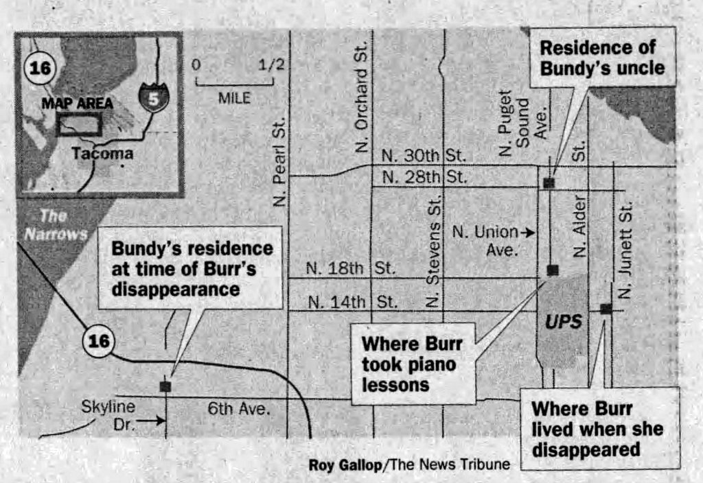 We all know that Ted Bundy didn’t ‘officially’ start killing women and young girls until early 1974… but at the same time it’s widely accepted he started his rampage years before that. Bundy first came up on police radar when he was a kid for being a peeping tom and shoplifter. Ann Marie’s case made national news when she disappeared in 1961, and there was a renewed buzz surrounding it in 1978 after it was realized the infamous serial killer grew up fairly close to her neighborhood. After Ted was arrested in Florida in 1978 he was considered a suspect in Ann Marie’s case when it was revealed that at the time of her disappearance he was 14 and living near the Burrs home in the West End of Tacoma at 658 North Skyline Drive (which is about 3.3 mile away). Additionally, there is no concrete alibi for Ted during the time in which Ann Marie went missing. His parents said he was in bed, but I mean… are they undeniably, 100% certain where he was on a random night in the summer of 1961? It’s impossible. I did read somewhere that at the time of Ann’s disappearance Mrs. Bundy made periodic, frequent walks through the house (she had younger kids at the time), and said she doesn’t remember anything out of the ordinary that particular night. It’s also worth mentioning it’s a pretty popular myth that Ted’s (favorite) Uncle Jack taught Ann Marie piano at one point in time (he didn’t), and he lived at 1514 South Adler Street in Tacoma (which is only 1.4 miles away from the Burrs). Jack Cowell was a professor of music at the nearby University of Puget Sound. Another common myth about Bundy and the Ann Marie Burr case is that he was the family’s paperboy at the time of her disappearance, but it turns out he wasn’t and his route was roughly 3 miles away. At the time Burr disappeared in 1961, 14 year old Ted had no drivers licenses or access to a vehicle, so if he did abduct her he most likely made the trek over to her house on foot. I mean, I was an out of shape 38 year old when I made the walk around Tacoma and it was definitely doable. Although it was stormy the night Ann Marie disappeared, that probably wasn’t enough to stop Bundy from making the walk. Or maybe he rode his bike over to her house and stashed it somewhere until he could come back and retrieve it?