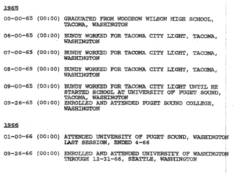 The school was in the middle of a large expansion project at the time in the summer of 1961, and was in the middle of constructing eight new buildings on campus. Donald Burr claimed that he saw a teenage boy that resembled Bundy digging a hole in a construction site and kicking dirt into it on the schools campus the morning his daughter disappeared. By the time law enforcement got around to investigating it was too late, and the project had advanced to the point of not being able to find any trace of the little girl. If Bundy did indeed dispose of Ann Marie’s body somewhere on the campus at the University of Puget Sound it must have been a real rush to attend classes there: every time he went to a function on campus, he would have revisited a victim, in a way. After just two semesters he left the school in 1966 and transferred to the University of Washington for a brief period to study Chinese. Shortly after he dropped out of school completely and worked an array of menial jobs across Seattle while also volunteering for Nelson Rockefeller’s presidential campaign.