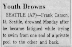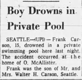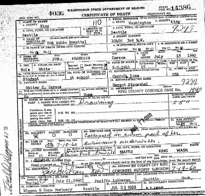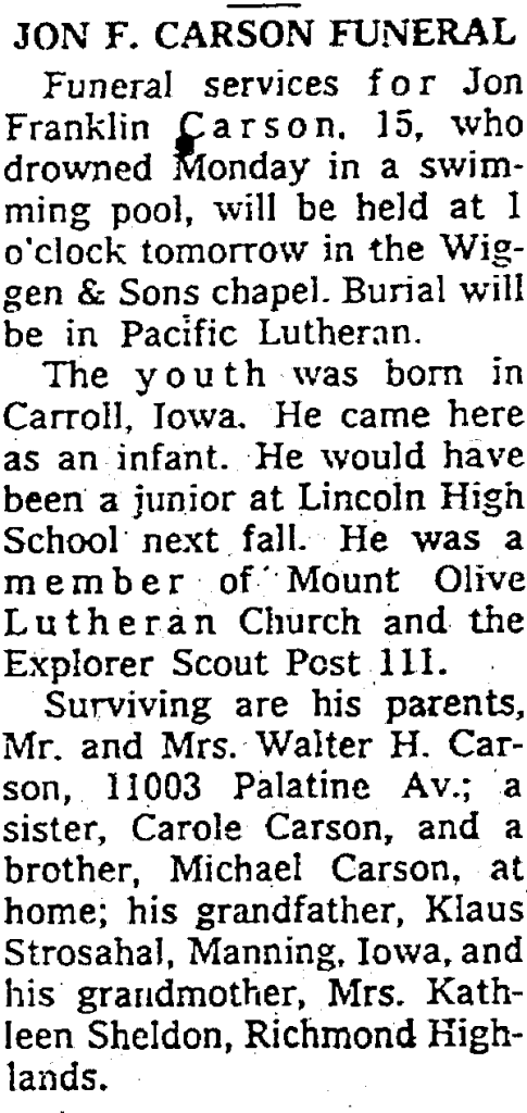 Jon Franklin Carson was born on August 5, 1944 to Walter and Margot Marie Magdalena (nee Strosahl) Carson in Carroll, Iowa. After relocating with his family to Washington state as an infant, at the time of his death he was about to enter his junior year at Lincoln High School in Seattle, and he was a member of Mount Olive Lutheran Church in Seattle and the Explorer Scout Post 111. Jon drowned on July 18, 1960 at the age of fifteen after he had gotten fatigued after trying to ‘swim underwater from one end of a private pool to another then back;’ he is buried at the Evergreen-Washelli Memorial Park in Seattle.