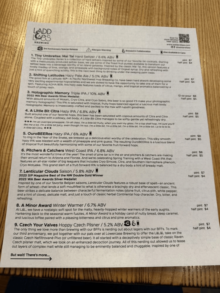 The outside of The (former) SandPiper Tavern, now called ‘Ladd & Lass Brewing.’ I took most of these pictures in April 2024 when I went to Seattle for the second time, and this time around I was able to go in and have (half) of a beer, as I am not a big drinker but at the same time wanted to be able to say I had a drink here.The entrance of Ladd & Lass Brewing, photo taken in April 2024.A picture taken the first time I went to Seattle, looking from the outside in, taken in April 2022.Another picture taken the first time I went to Seattle, looking from the outside in, taken in April 2022.The brew room at Ladd & Lass Brewing, photo taken in April 2024.A shot of the front part of Ladd & Lass Brewing, photo taken in April 2024.Another shot of the front part of Ladd & Lass Brewing, photo taken in April 2024.Another part of the brewery room at Ladd & Lass Brewing, photo taken in April 2024.The back part of Ladd & Lass Brewing. Photo taken in April 2024.A close up of the side wall at Ladd & Lass Brewing. Photo taken in April 2024.The back part of Ladd & Lass Brewing, by the bathrooms. Photo taken in April 2024.The front part of the bar, photo courtesy of Yelp and was uploaded by the user ‘Nick L.’A picture of a wall of the brewery with the beers on the wall at Ladd & Lass Brewing, taken from Yelp and posted by user ‘Jessica Z.’A picture of the tasing menu from Ladd & Lass Brewing, taken from Yelp and posted by user ‘Erica W’ on March 29. 2025.A picture of the beer cooler, where customers can take beverages with them when they go. Picture taken from Yelp and posted by user ‘Marcus S.’