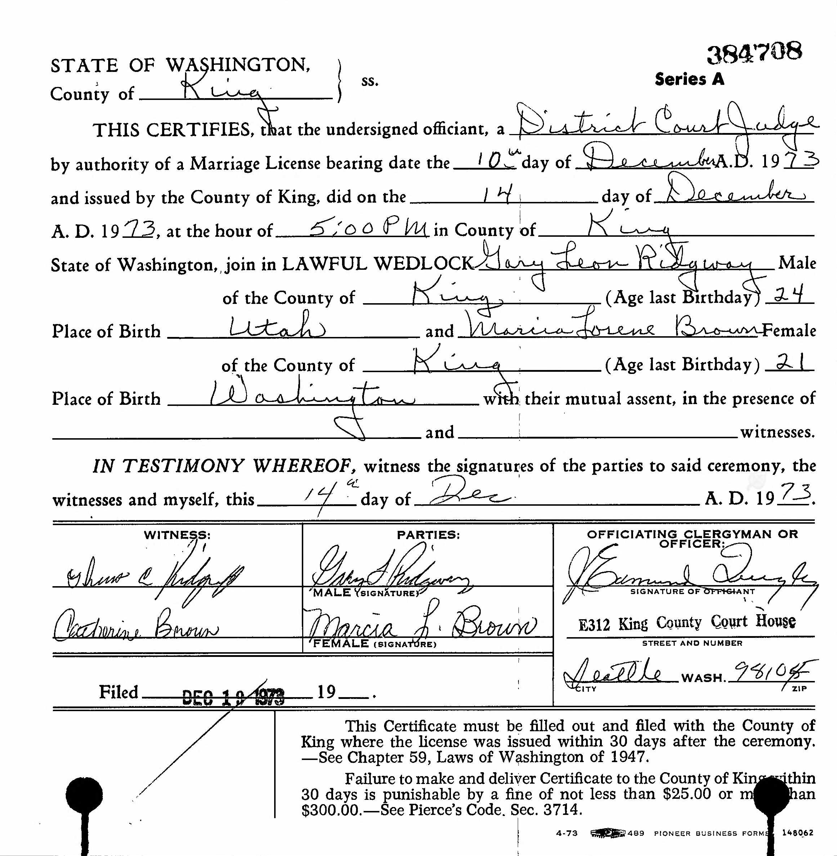 In 1985, Ridgway started seeing Judith Mawson after they met at the White Shutters Tavern; he eventually made her his third wife in 1988. Mawson claimed in a 2010 TV interview that when she moved into his house the floors were bare and there was no carpet. Detectives told her that Ridgway most likely wrapped a body in the carpet and never bothered to replace it. He did in fact bring most of his victims back to his house before murdering them. In that same interview, Mawson mentioned that her husband would frequently leave for work very early in the morning on some days, telling her it was for ‘overtime.’ She theorized that Gary must have committed some of his atrocities while allegedly working this early morning OT. Judith went on to say that she had no knowledge of his activities until she was contacted by detectives in 1987, even claiming to have had no knowledge of the Green River Killer at all due to the fact that she did not watch the news or read the paper.