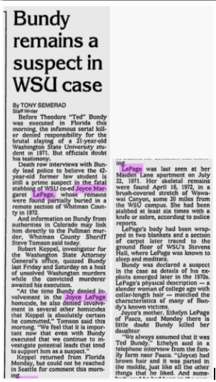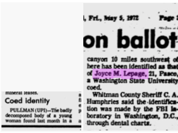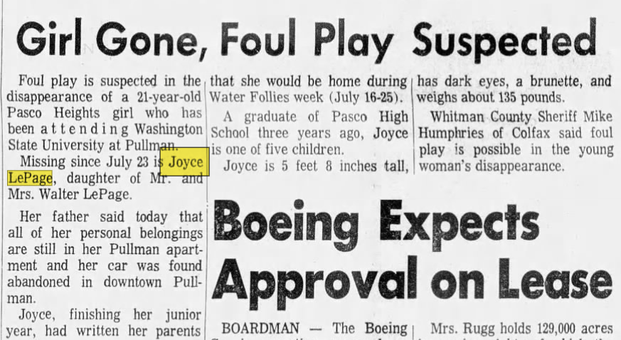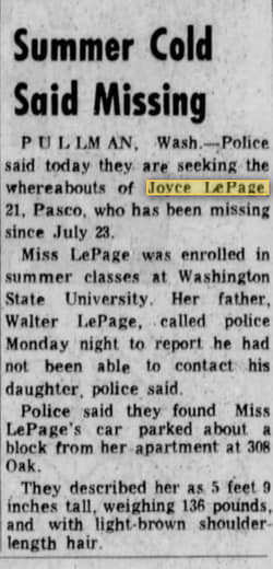 When researching this case I found a comment from Bruce LePage on Tiffany Jean’s article on Joyce: ‘DNA testing and fingerprint testing have been unsuccessful. Please remember that Joyce’s body was found nine months after her murder. Until then, her’s was just a missing person case. Once her body was found my father had her remains cremated. The Washington State crime lab was not able to identify definitive DNA samples. The prime person of interest in this case knows he is being watched.’