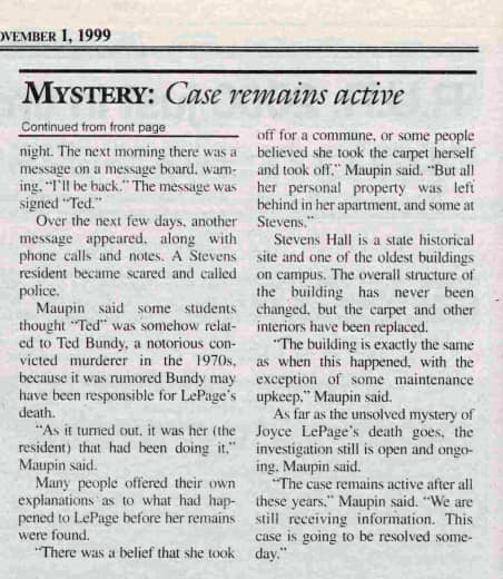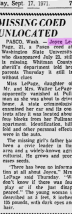 It is strongly speculated that there was a party in Stevens Hall on the evening LePage disappeared: WSU custodian Rosy Lord said that on the morning of July 23, 1971 the cleaning crew came into a mess, and there were pizza boxes and ‘drug paraphernalia’ strewn all over the place. A friend of Joyce’s told law enforcement that she was planning on going to the residence hall the evening she disappeared, but no one could place her there. A neighbor told police that they saw her getting into a car with two unknown men early in the morning on the 23rd, but nothing ever came of this report. There were additional rumors being floated throughout the community: some suspected the attractive young woman ran off to join a commune, while others felt it was her that she stole the piece of carpet and took off with it (but why?). Additionally, a psychic came forward and told police he had a vision of the young girl getting on a plane for Argentina with a ‘Latin boyfriend.’